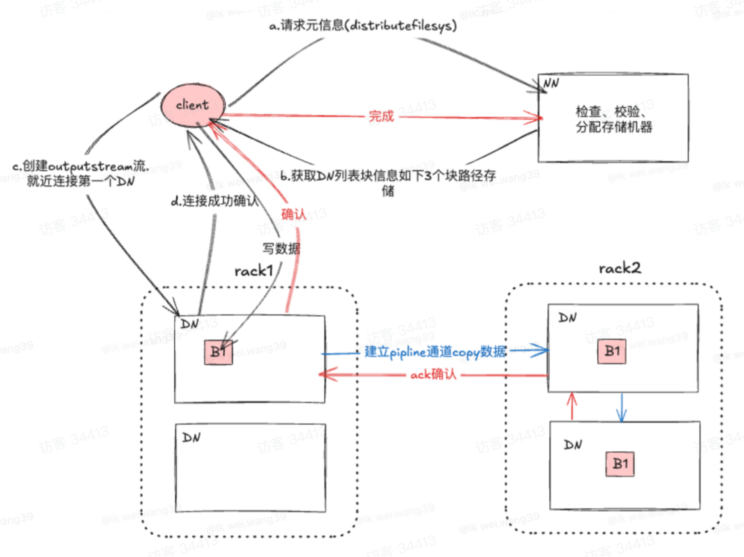 写完之后, DataNode 向其他机架上的节点建立备份
