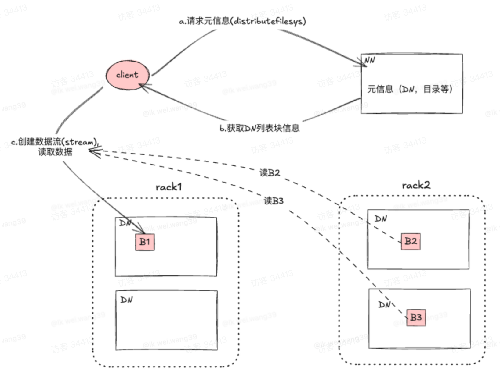 客户端拿到元信息之后, 按照其中的路径与 DataNode 依次交互