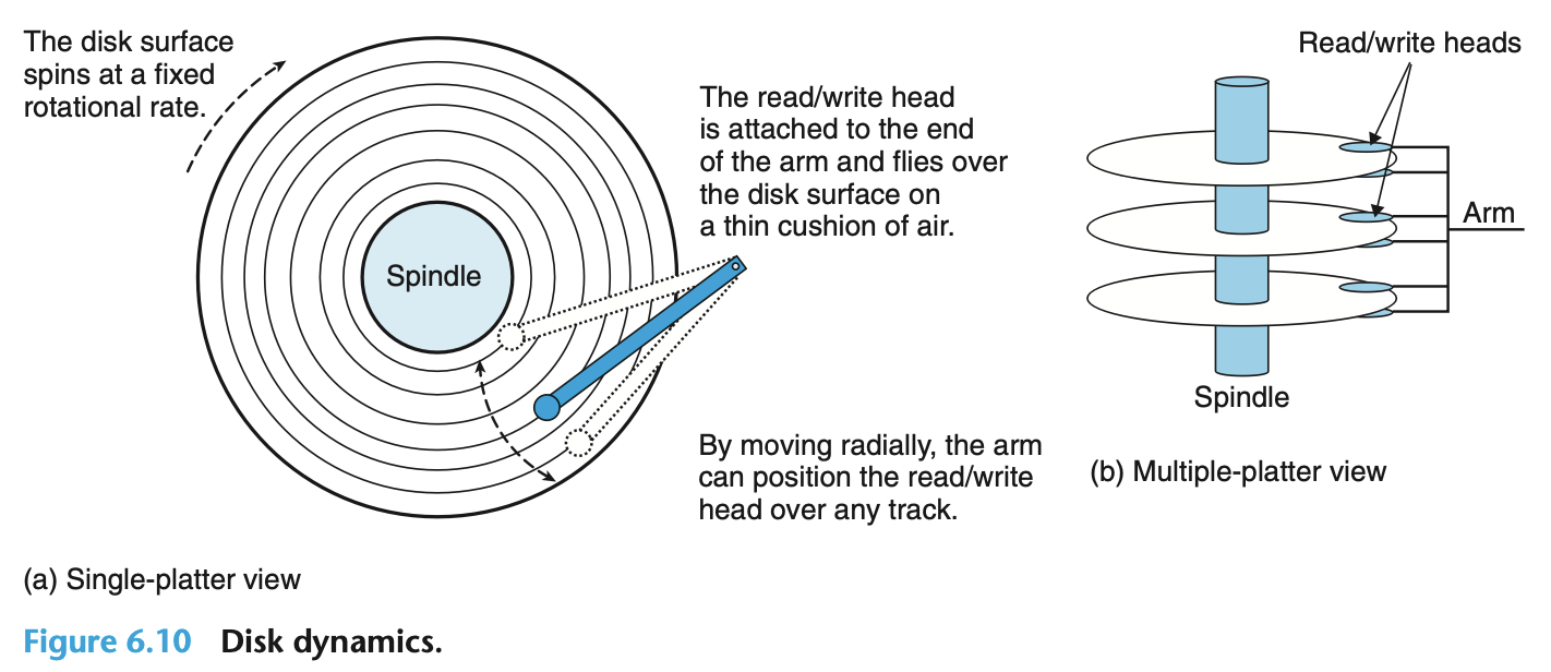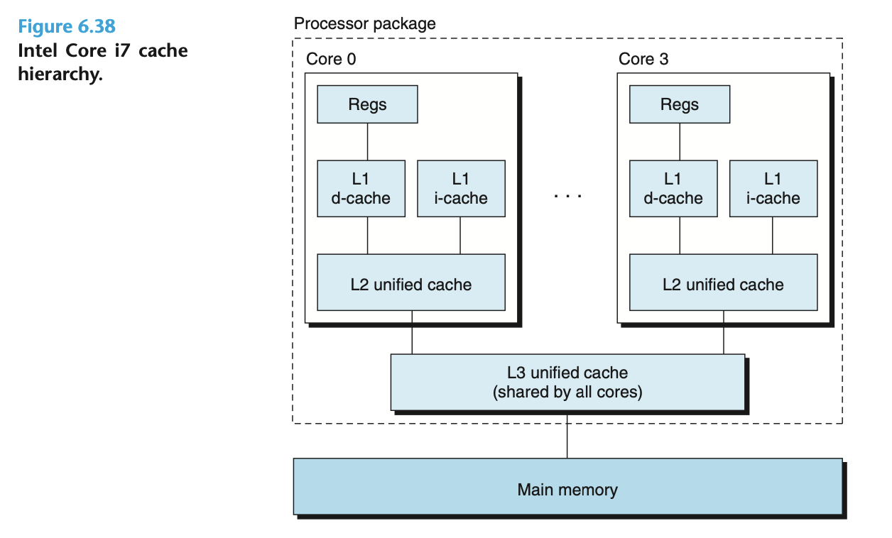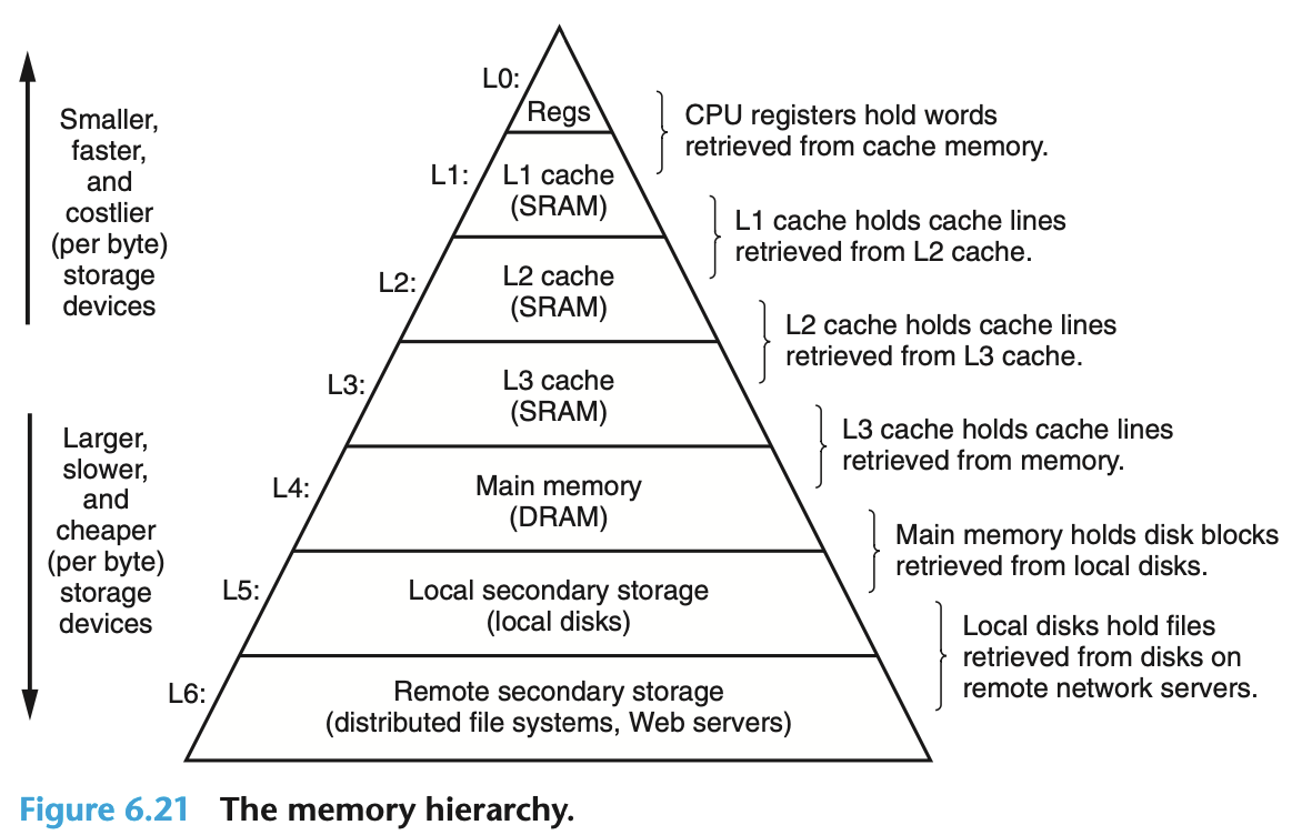 存储层级的本质是让较高一层 (更靠近 CPU) 的设备作为较低一层的设备的缓存. 这一方面直接体现在硬件组织上, 另一方面, 程序也会尽可能利用局部性规律 (空间和时间).