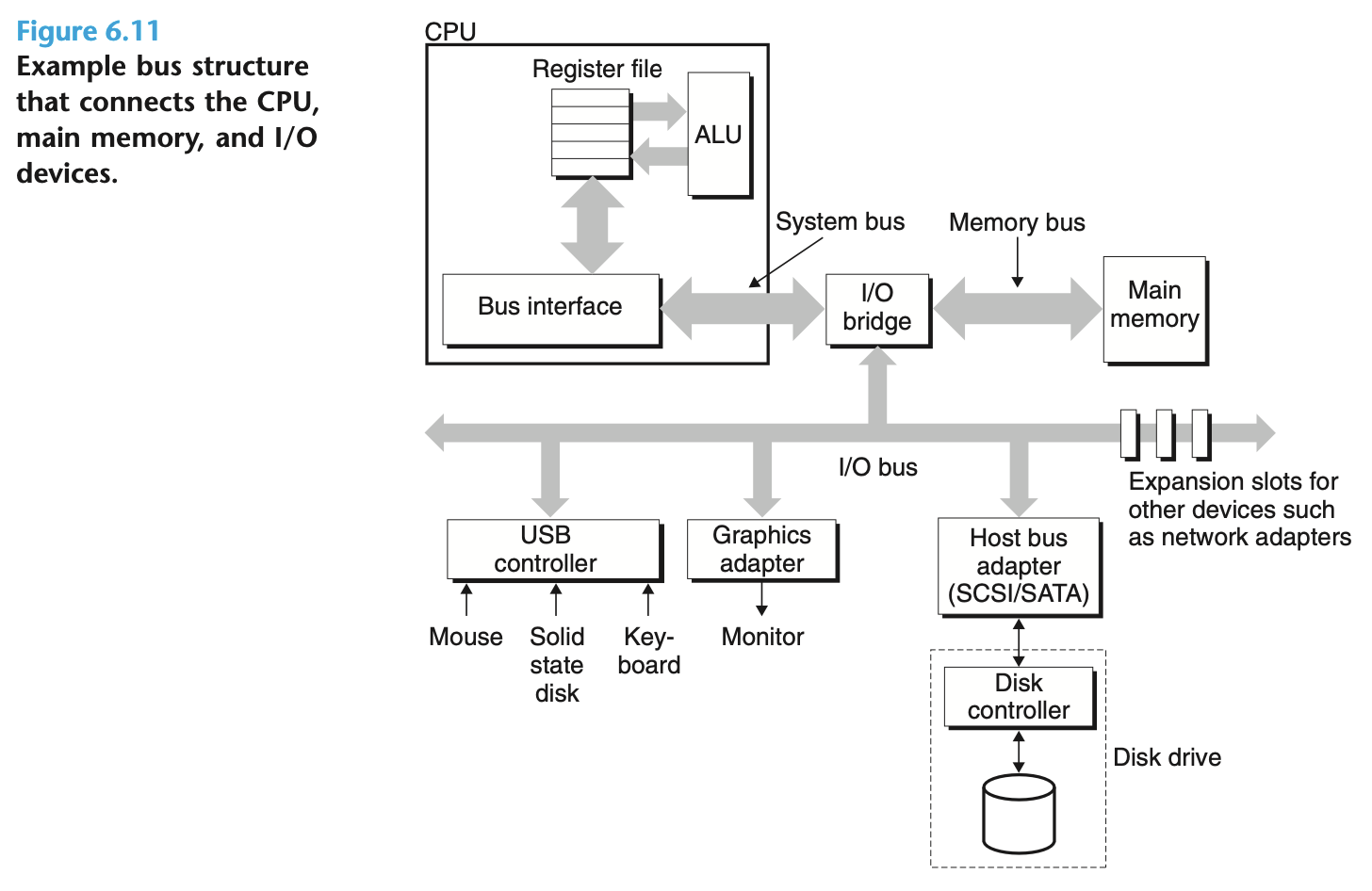 从系统的角度看, I/O 设备通过 bus 连接, 再通过 I/O bridge 与 CPU 和内存进行数据传输: