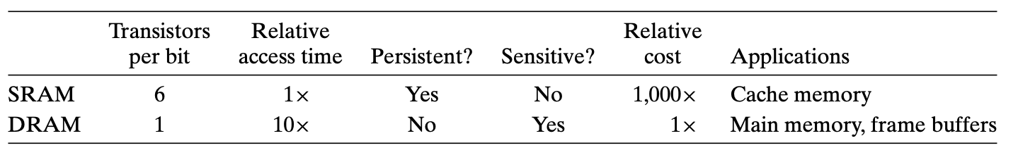 SRAM (贵, 快, 稳定, 较多用于 Cache) vs. DRAM (不稳定, 需要不断刷新, 较多用于内存)