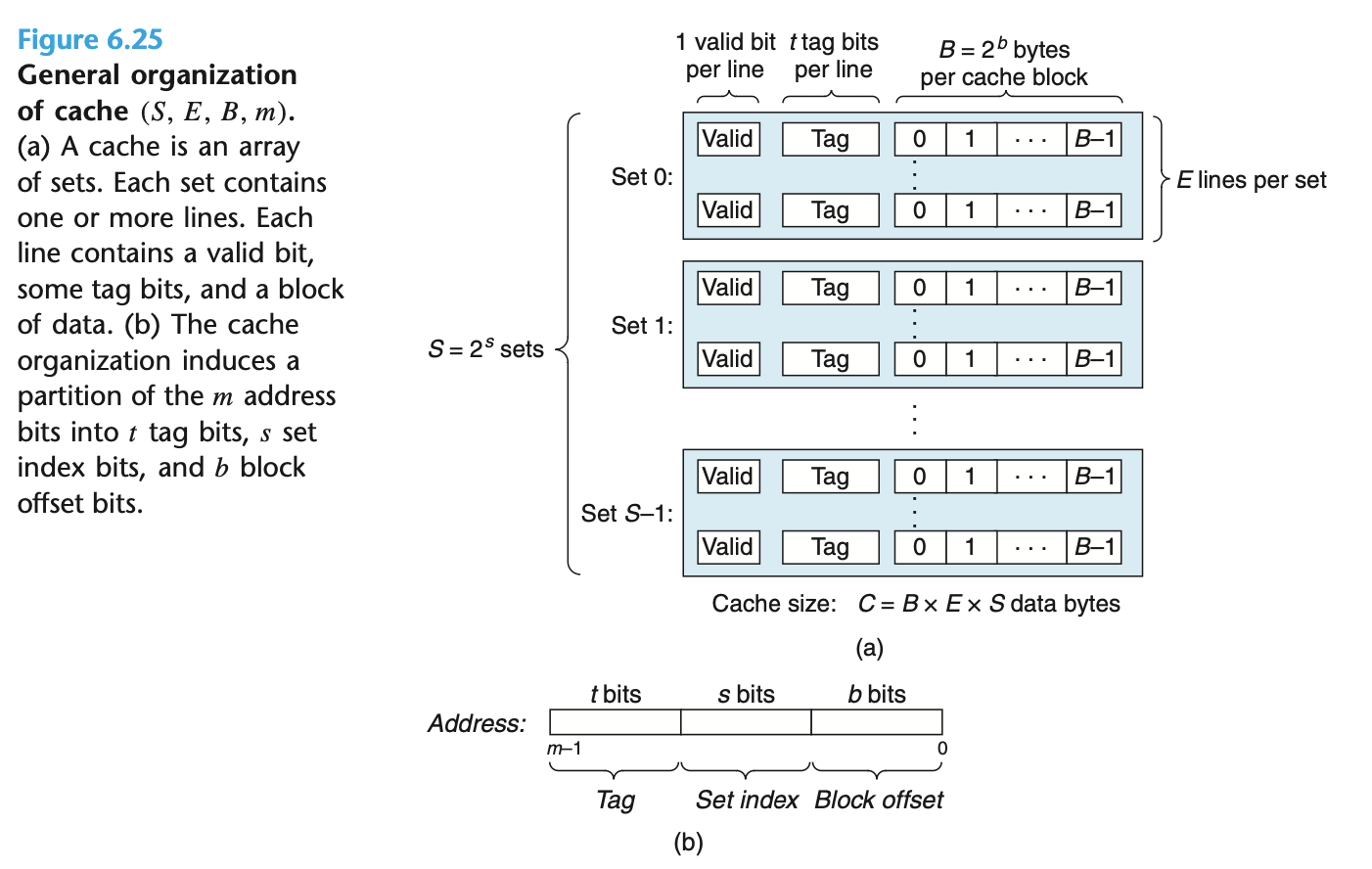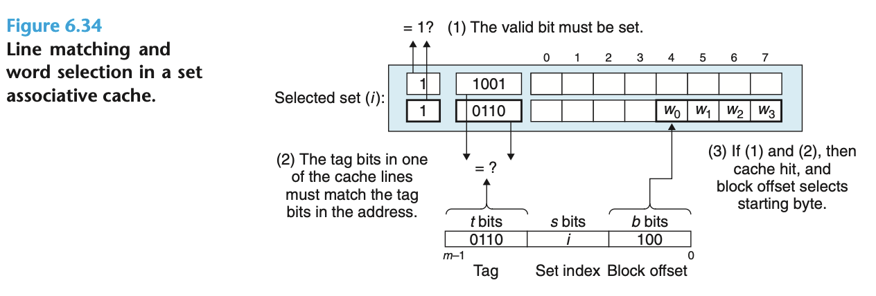 通用的多路关联内存缓存结构如下. 一个 Set 可以包含多个缓存行, 一行对应一个缓存数据块 (2^b 字节). 内存地址中间的 s 个 bits 决定此处的数据应该被缓存在哪个 Set (一共有 2^s 个 Set), 高位的 t 个 bits 则用作同一个 Set 内部的标识. 用中间的 bits 作为 Set 索引, 是为了充分利用程序的空间局部性, 若改用高位作索引, 则后续的 2^t 个内存块会被映射到同一个 Set, 空间局部性被没有被利用起来.