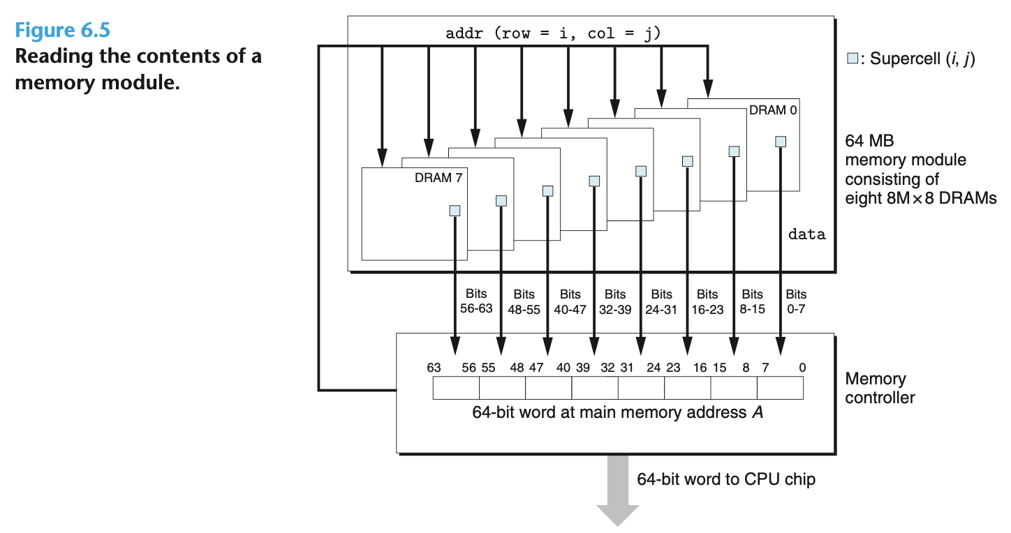 内存模块说的是多个 DRAM 的组合, 例如, 8 个 8M 的 DRAM 组成了 64M 的内存, 每次读写的数据实际上是由 8 个单元共同拼接起来的: