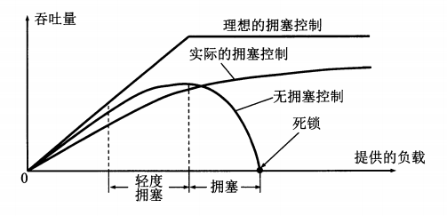 流量控制是点对点通信量的控制, 拥塞控制是全局性的控制. 所谓拥塞, 是说在某个时间段中, 对网络中某一资源的需求超过了该资源的可用部分 (请求量太大), 导致网络性能下降. 在无拥塞控制的情况下, 负载增大到一定程度时, 网络的吞吐量将随负载的增大而下降, 极端情况下, 网络会瘫痪.