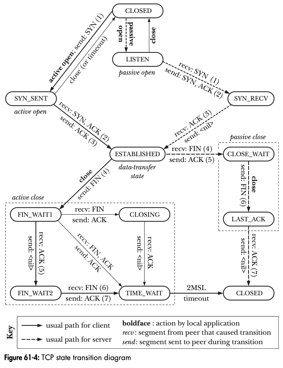 FIN_WAIT1 (请求断开连接) / CLOSE_WAIT (不再接收数据) / FIN_WAIT2 (不再发送数据) / LAST_ACK (连接中的所有数据已经发送完毕) / TIME_WAIT (连接释放倒计时) / CLOSED (关闭连接)