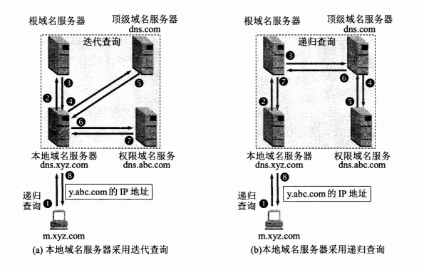 本地域名服务器向根域名服务器大多数采用迭代查询, 根域名服务器要么给出所要查询的 IP 地址, 要么告诉本地域名服务器下一步应向哪个域名服务器查询, 以此类推.
