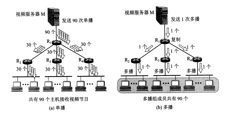 IGMP 指网际组管理协议, 用于让路由器知道多播 (multicast) 组的成员信息, 多播技术用于在一对多的通信中节省网络资源, 服务器只需发送一次分组, 路由器在转发时会对分组进行拷贝, 发往不同的局域网, 当分组到达局域网后, 通过硬件多播到达所有成员.